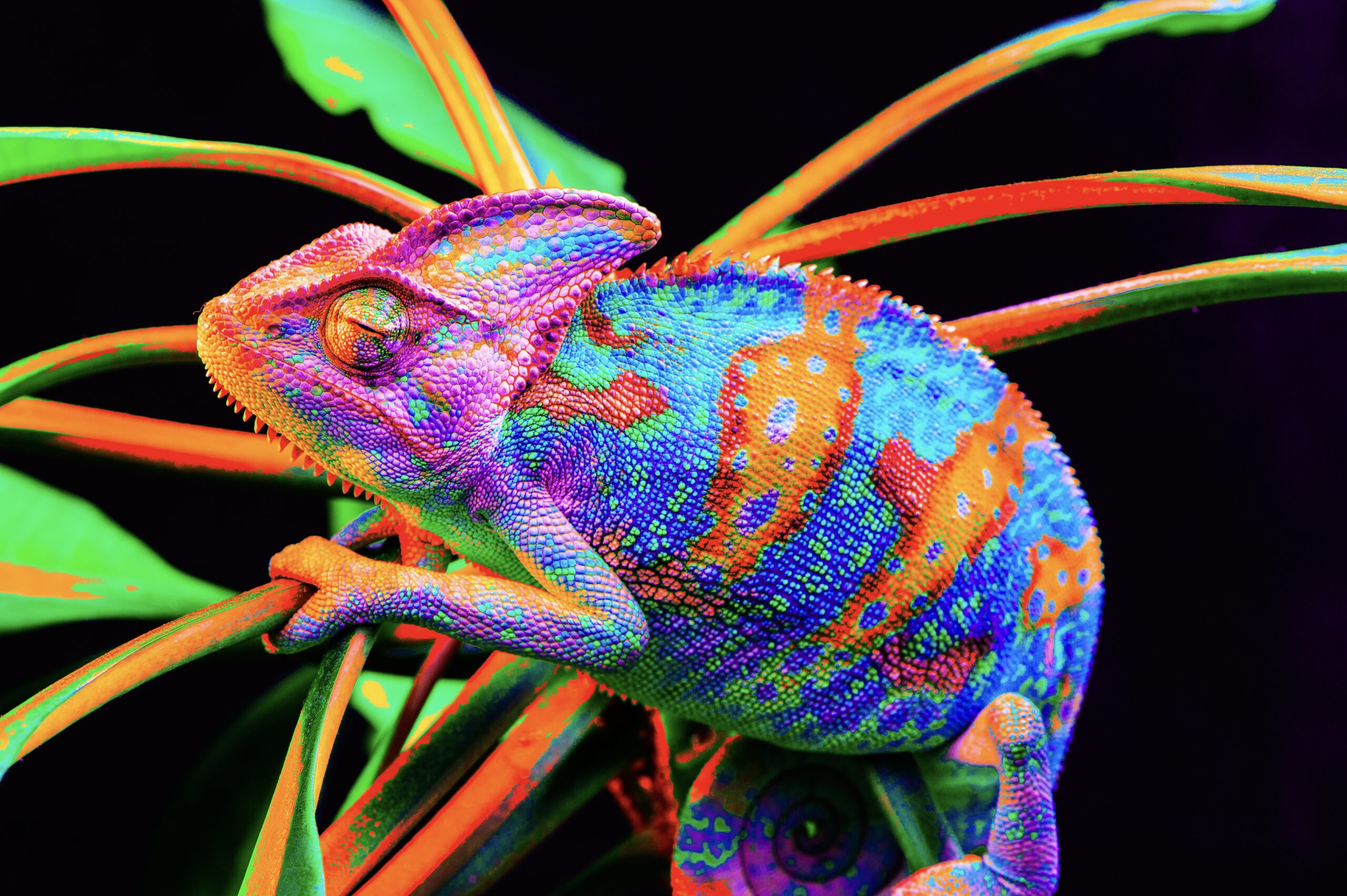 Yemen Chameleon is native to the Arabian Peninsula in Yemen and Saudi Arabia. Males grow to around 17-24 inches in length and females around 14 inches, they grow casques on their head and are born as pastel green before growing stripes and more colorful as they grow. They are known for their variable color changes due to a variety of factors, including to show aggression, social status, reproduction, and stress.