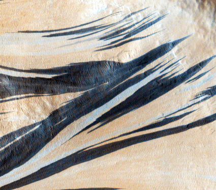 Dark, finger‑like marks slide down countless Martian cliffs each year....