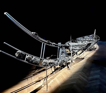 The Hjortspring boat - a sleek wooden warcraft pulled from...