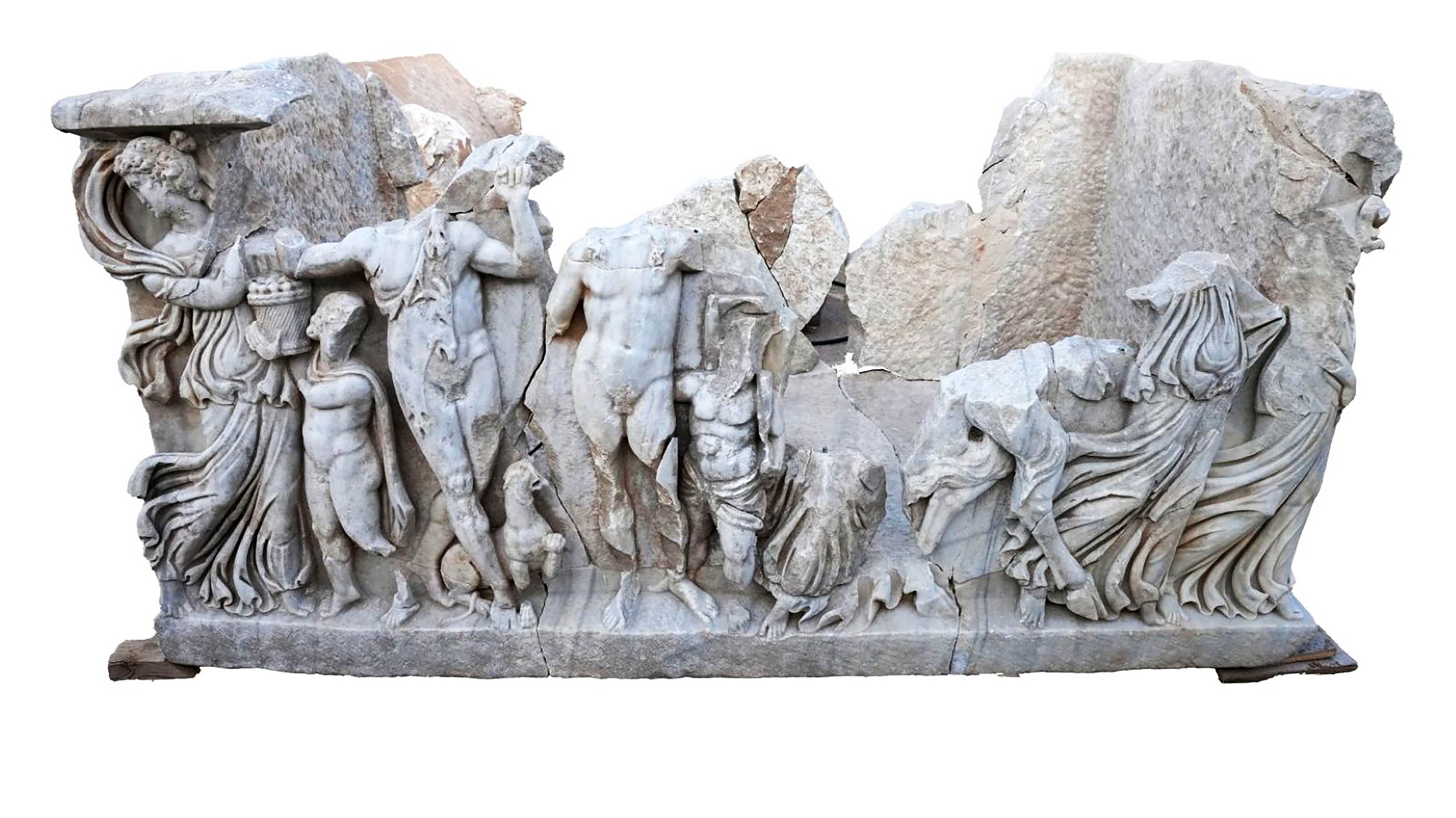 The marble broke into pieces long ago and lay hidden under dune sand. The conservation team cleaned, matched, and joined the blocks so the full scene could be read again.