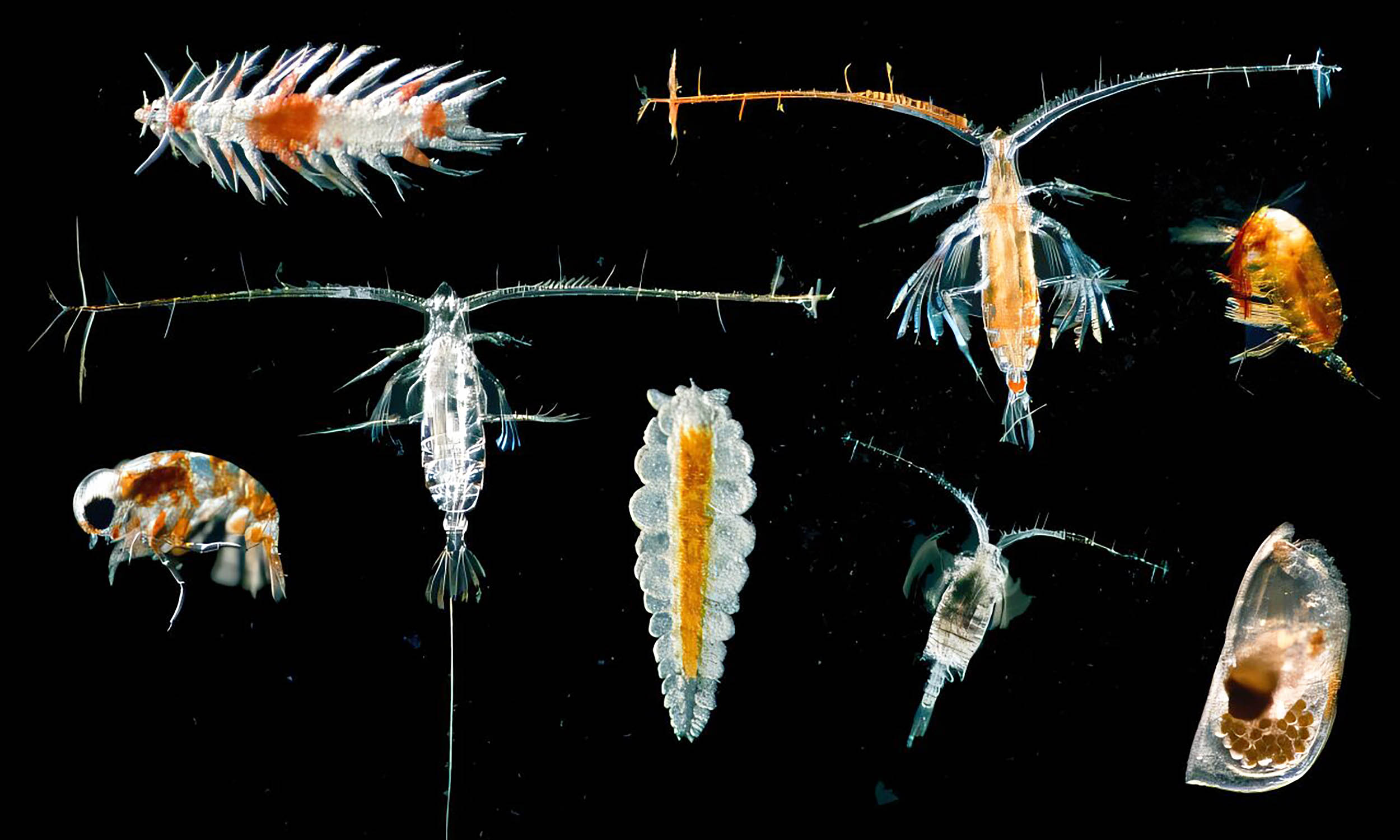 The twilight zone is packed with life adapted to darkness and scarcity: krill, lanternfish, siphonophores, gelatinous predators, and more.