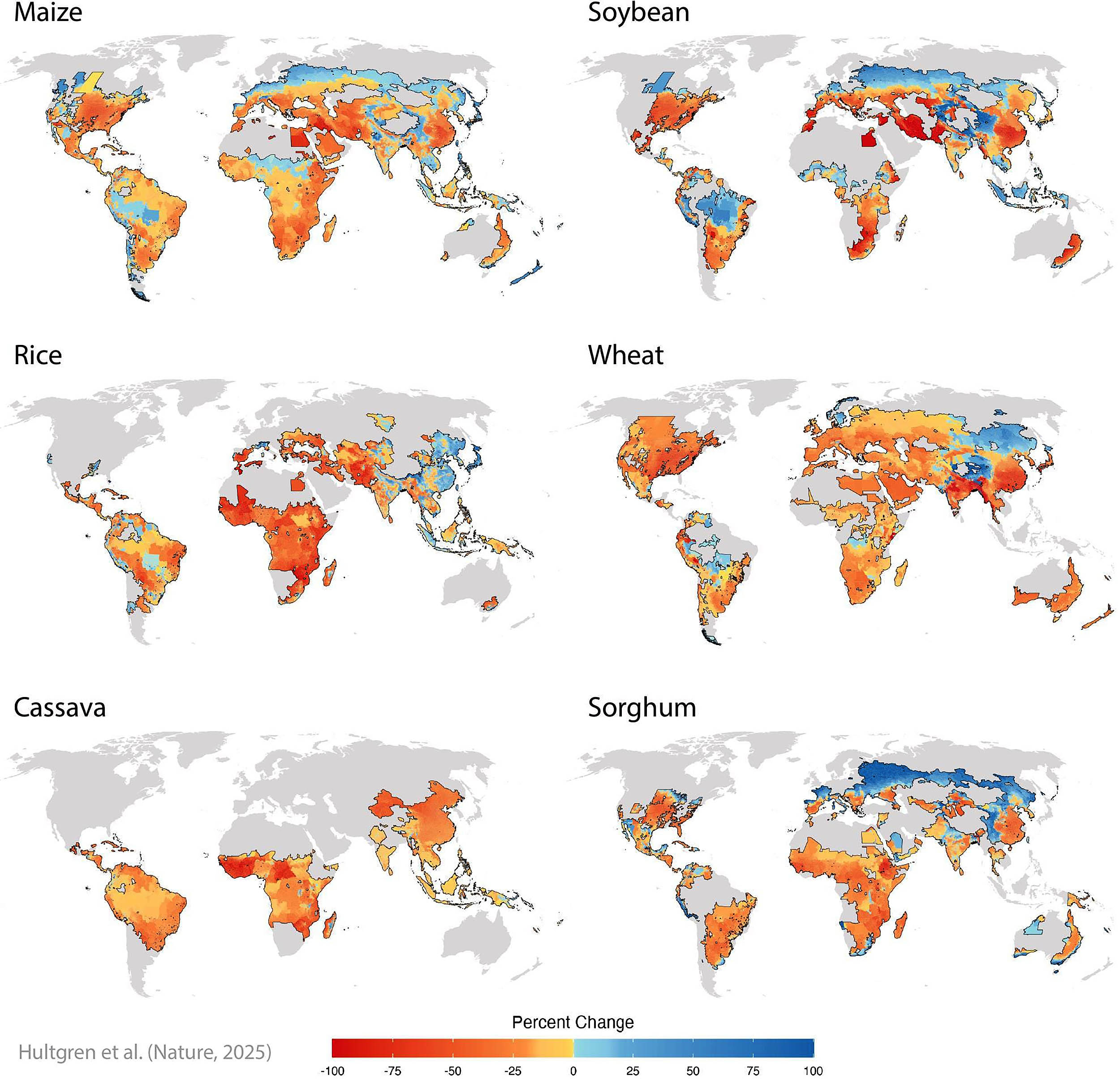 To move from global averages to actionable insights, the team linked climate variables to yields for six staple crops: corn, rice, wheat, soy, cassava, and sorghum.