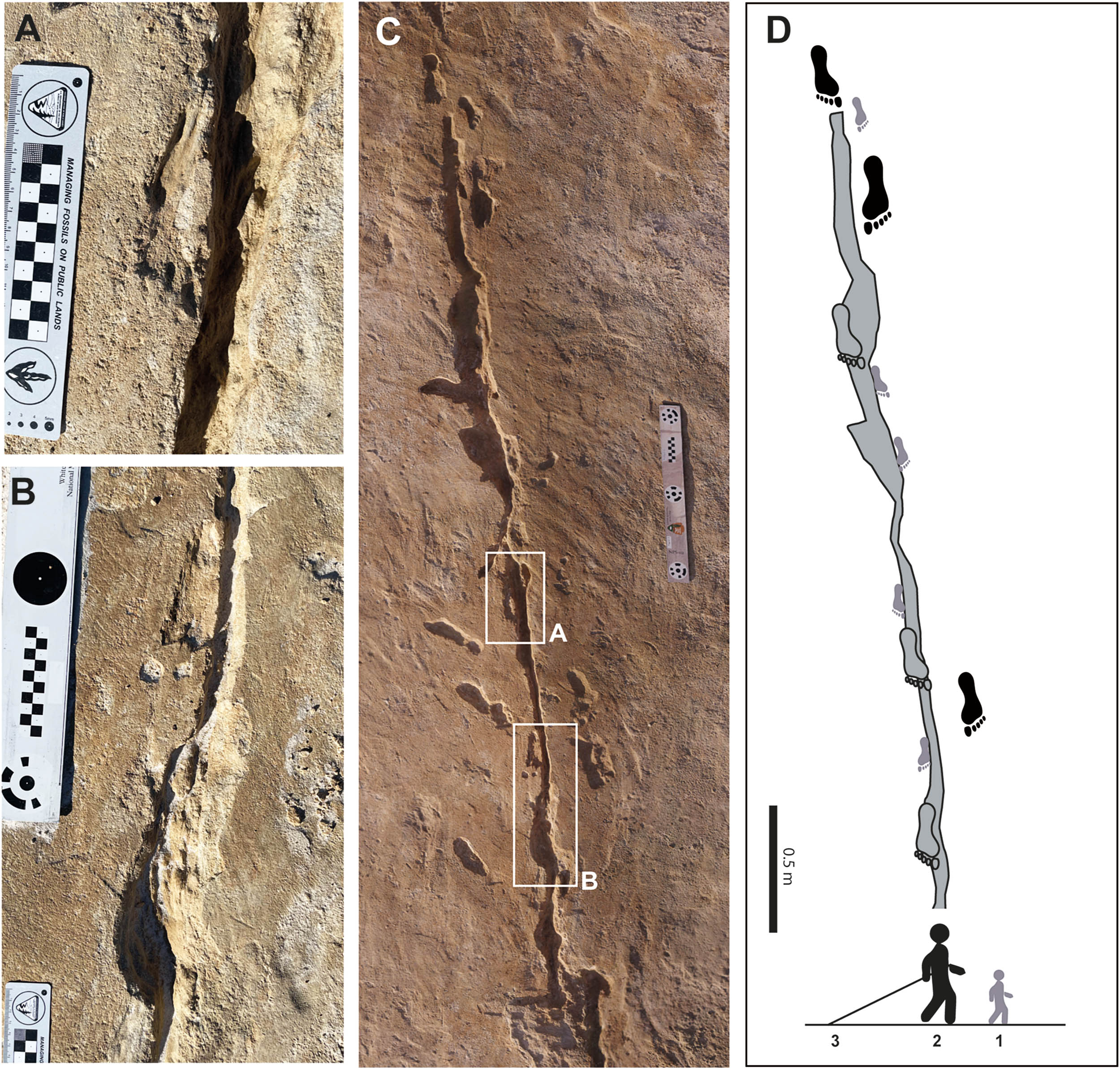 Grooves rarely appear alone; there are footprints of different sizes walking beside them, crossing them, or even stamped right into the channels.