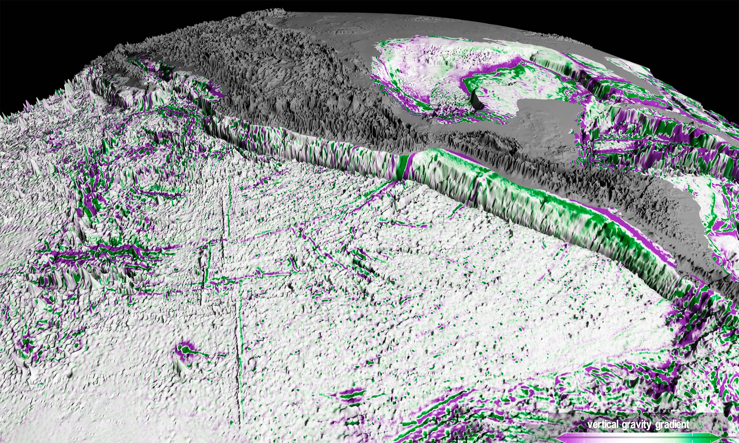 Measure those heights very precisely, convert them into gravity gradients, and you get a crisp portrait of edges and bumps on the seafloor.