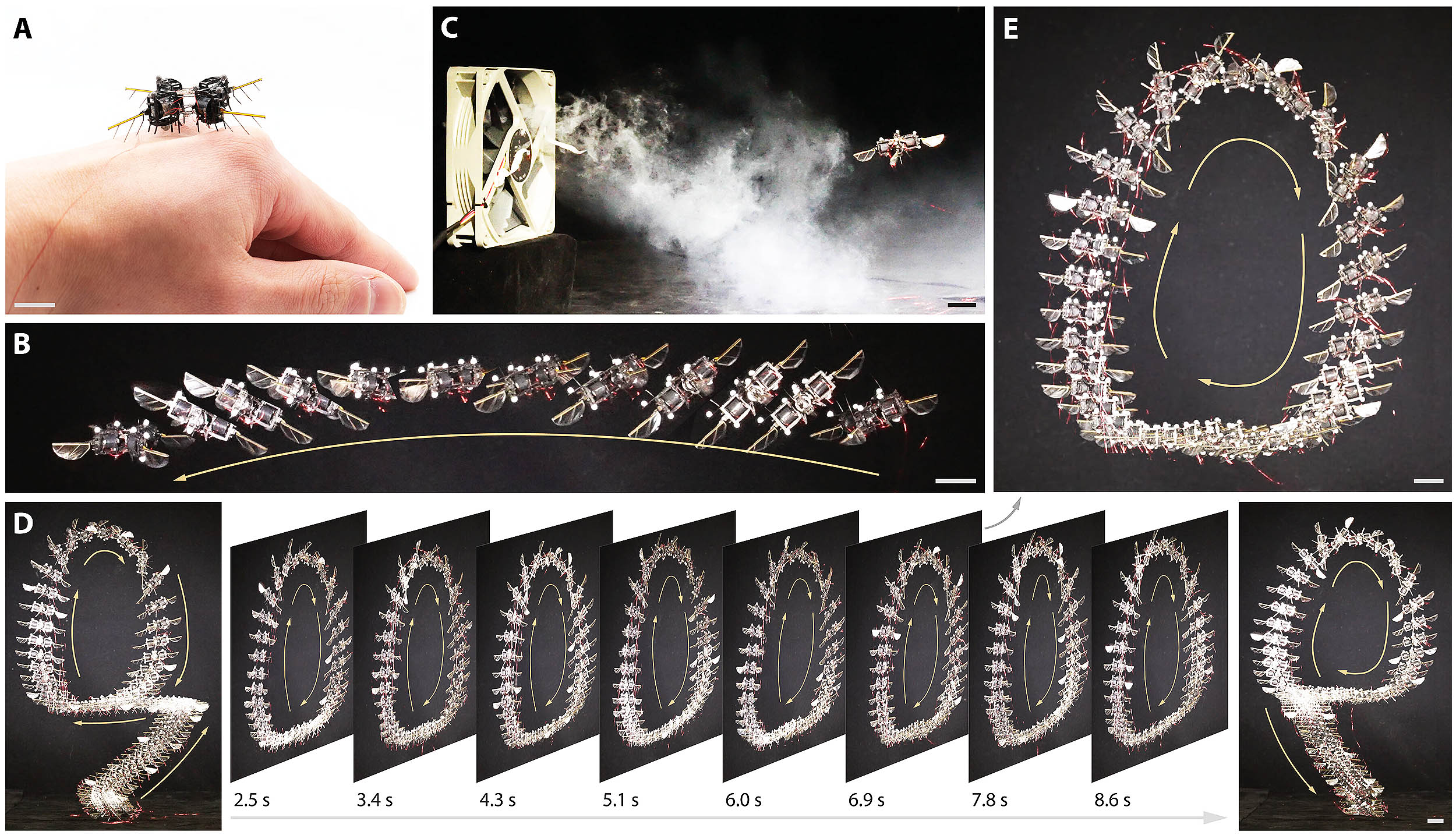 ![Overview of flight maneuvers performed by a 750-mg flapping-wing aerial robot. (A) Image of the robot resting on the back of the hand. (B) Composite image of an insect-like body saccade maneuver. (C) The robot tracked a repeated saccade trajectory under a 160-cm/s wind disturbance. (D) Time sequence of composite images that illustrate 10 consecutive body flips in an 11-s flight. (E) Inset image of (D) that illustrates the seventh flip in the flight experiment. Scale bars in [(A) to (E)] represent 1 cm. Credit: MIT](https://cff2.earth.com/uploads/2025/12/15123041/microrobots_flight-maneuvers_MIT_1s.webp)