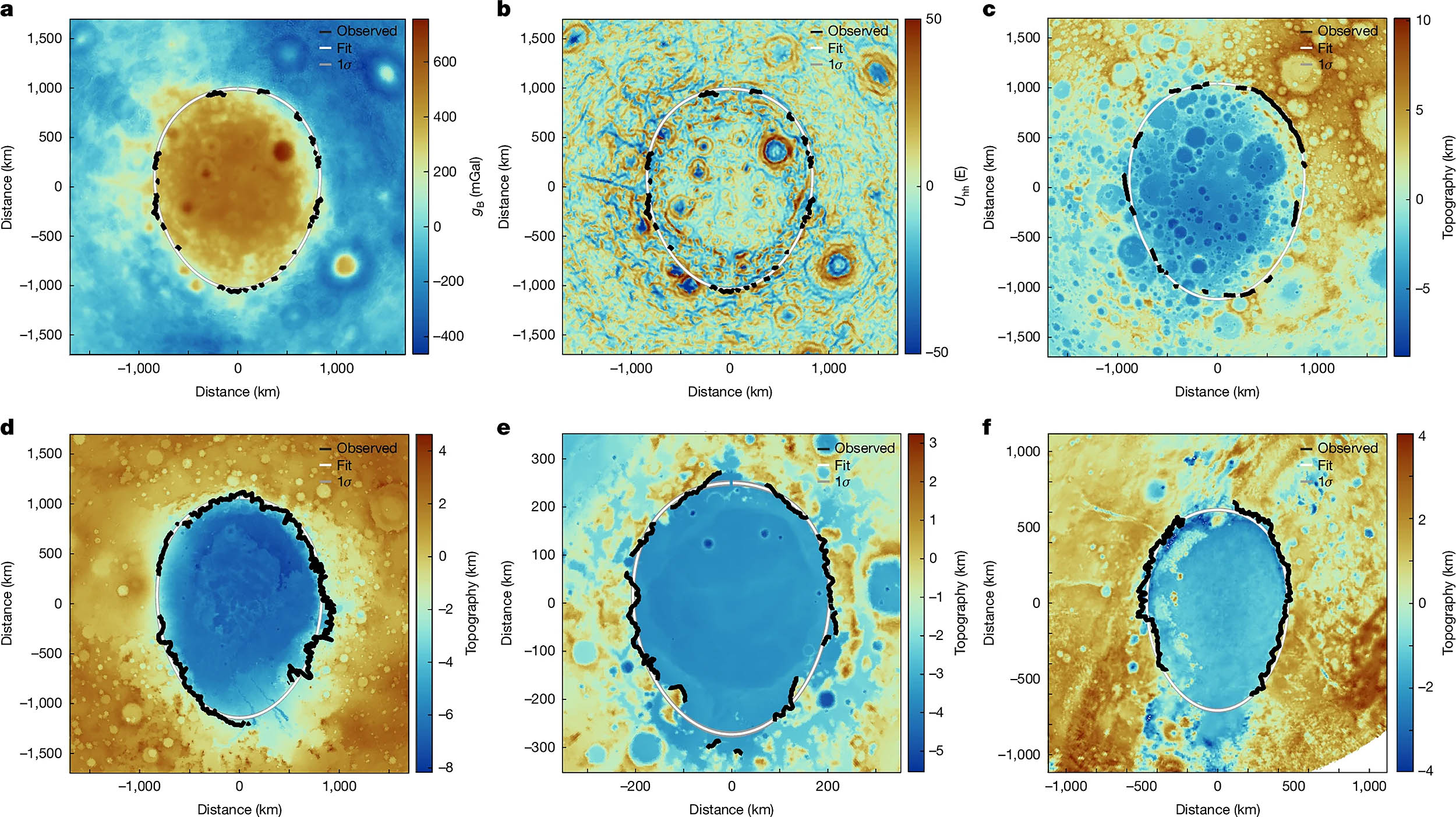 Shapes of other giant basins back the pattern. Hellas on Mars and Sputnik on Pluto also narrow in their downrange direction.