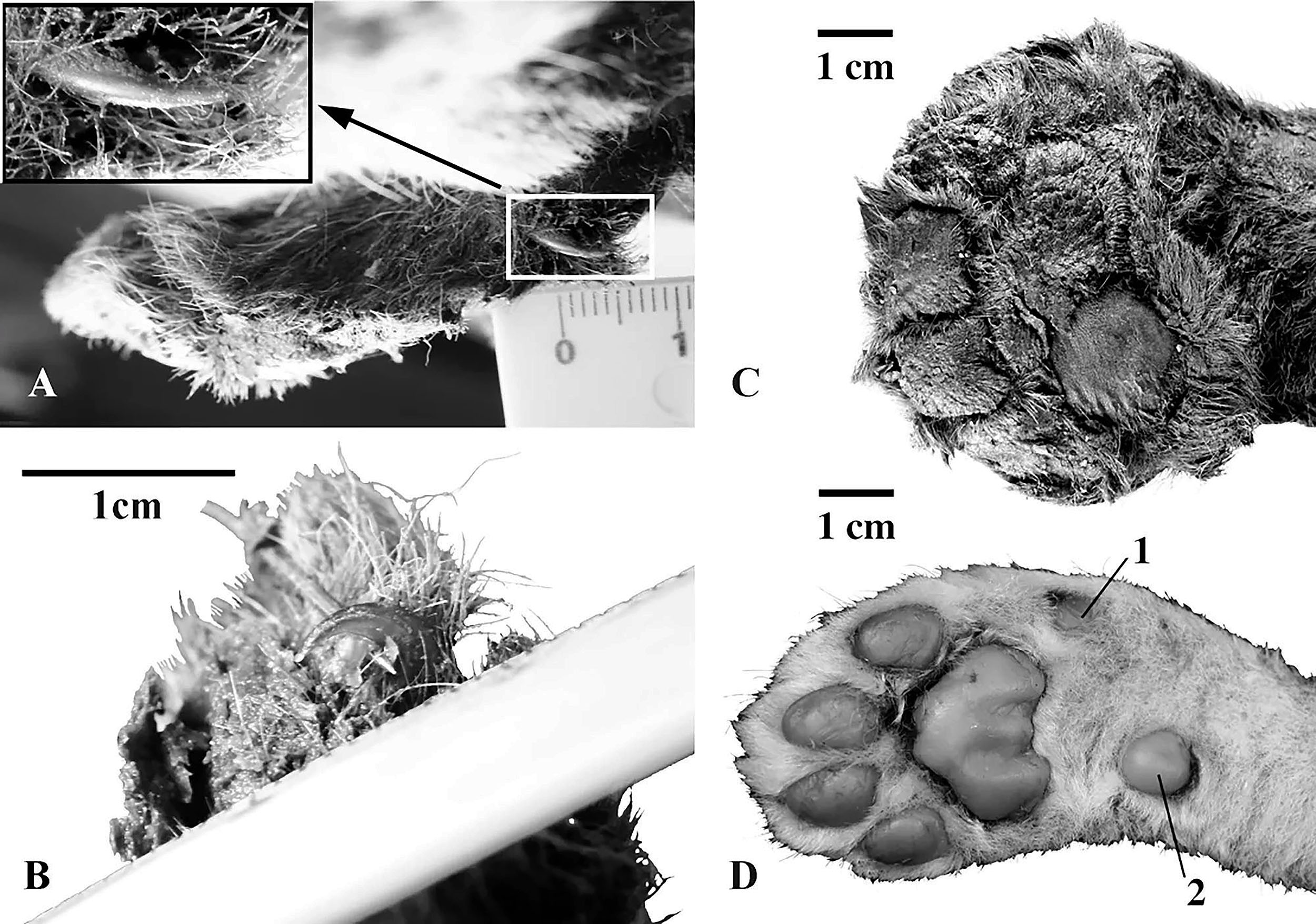 The front paw has a broad, rounded pad – nearly as wide as it is long – unlike the more oval pads of a lion cub. Some of the small pads near the wrist are reduced or missing.