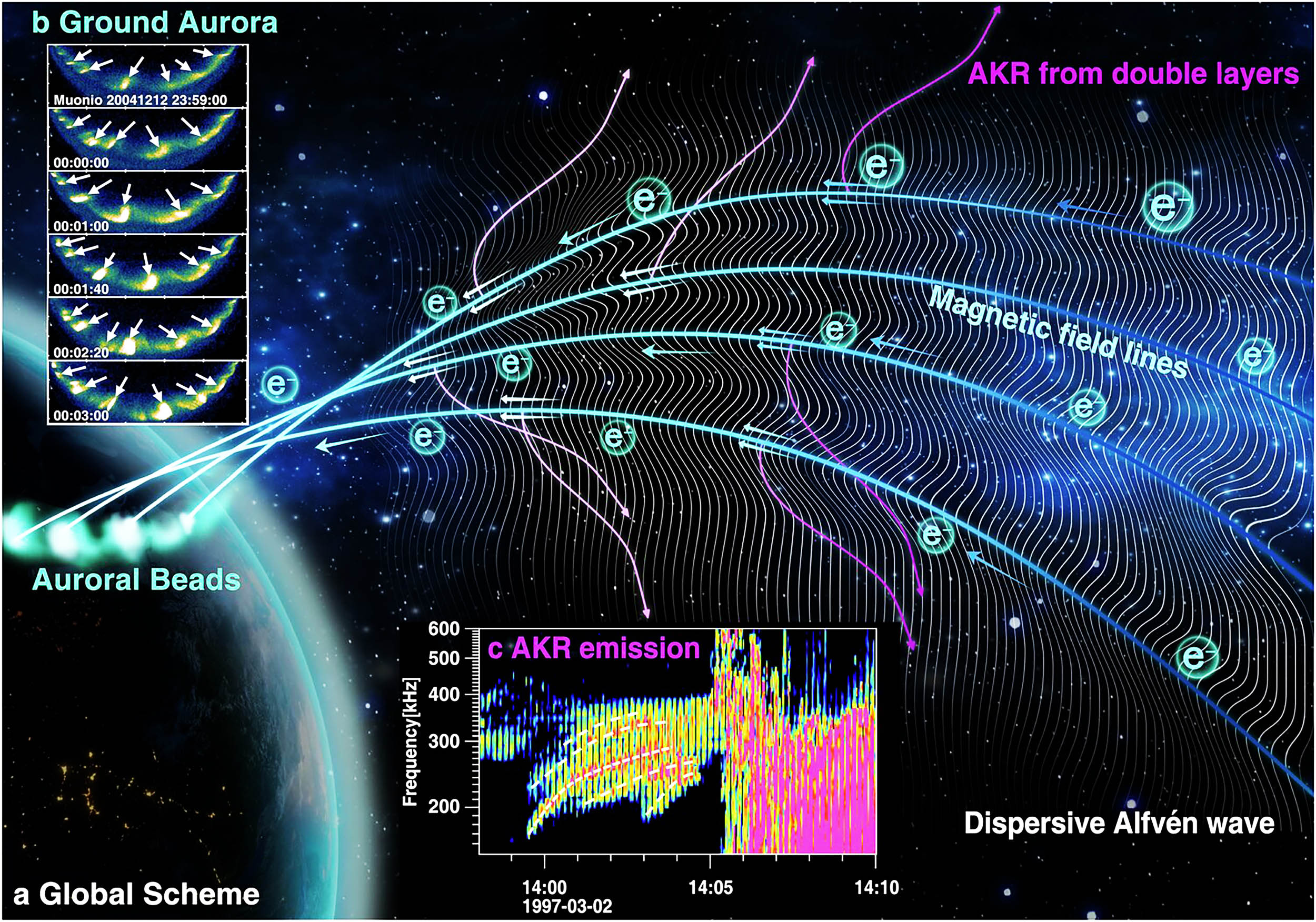 Once reaching lower altitudes, wave fronts disturb plasma and energize electrons. That process activates double layers, which then slide along magnetic field lines.