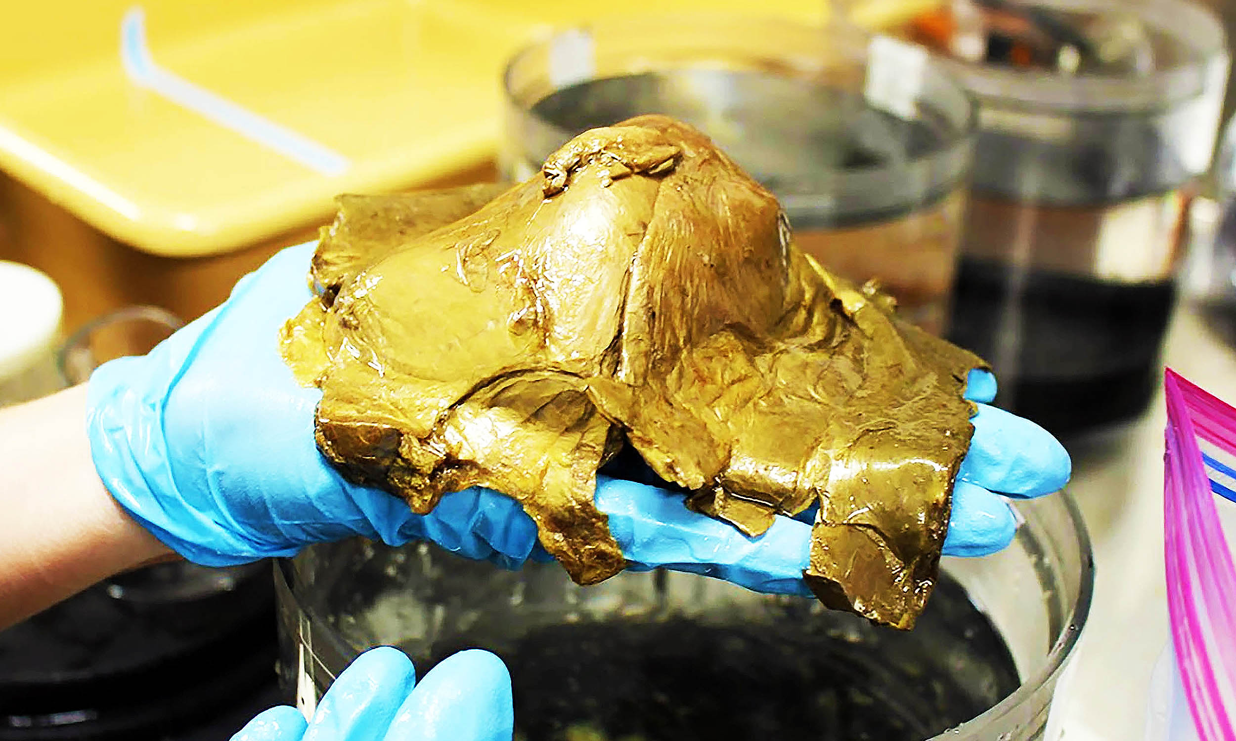 The team used the ROV’s arm to collect the “golden orb” and bring it onto the ship. Tests on board showed that it is biological in origin, although the researchers have not yet been able to identify what kind of organism it belongs to.