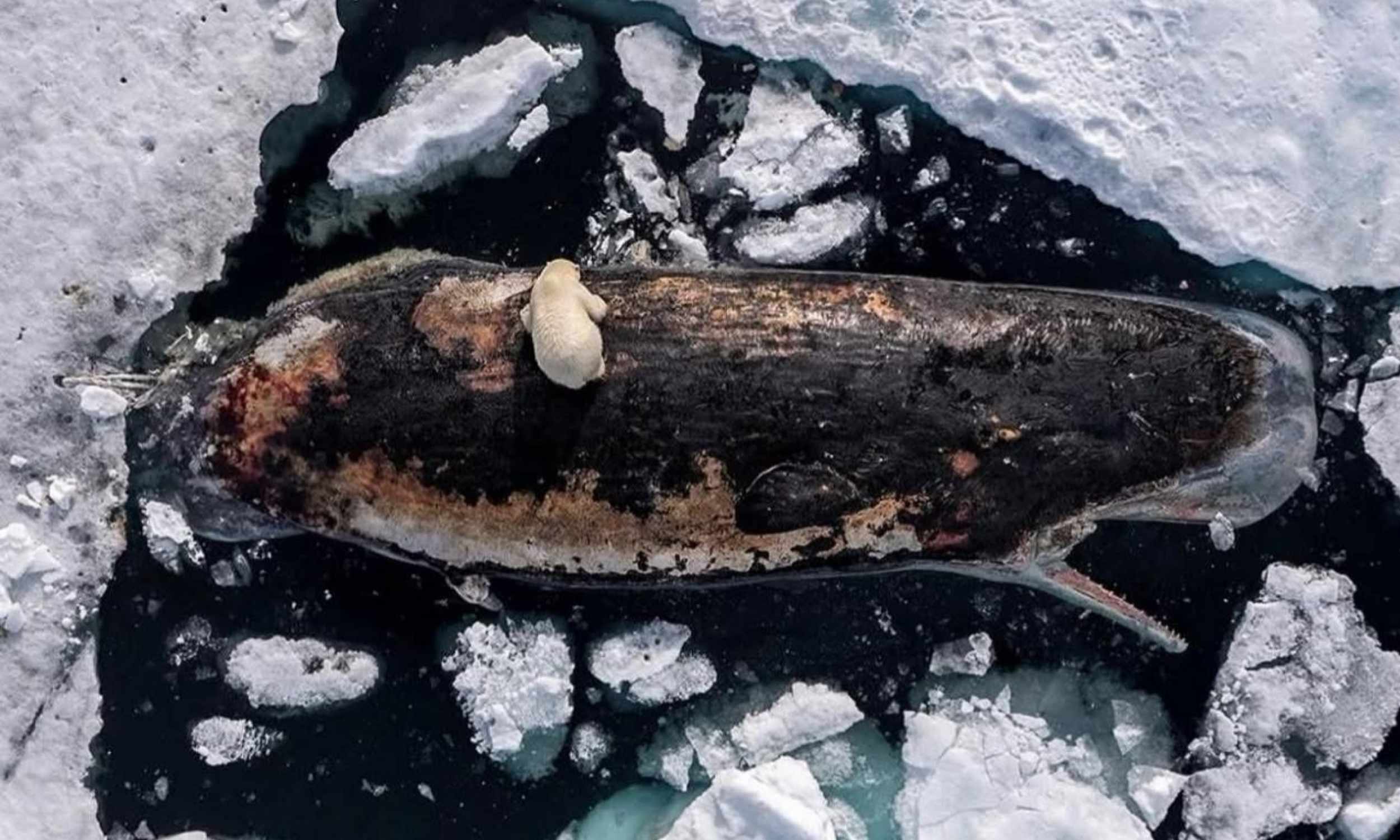 Deep in the Arctic Ocean on broken sea ice near Svalbard, a polar bear was photographed tearing into the body of a dead sperm whale.