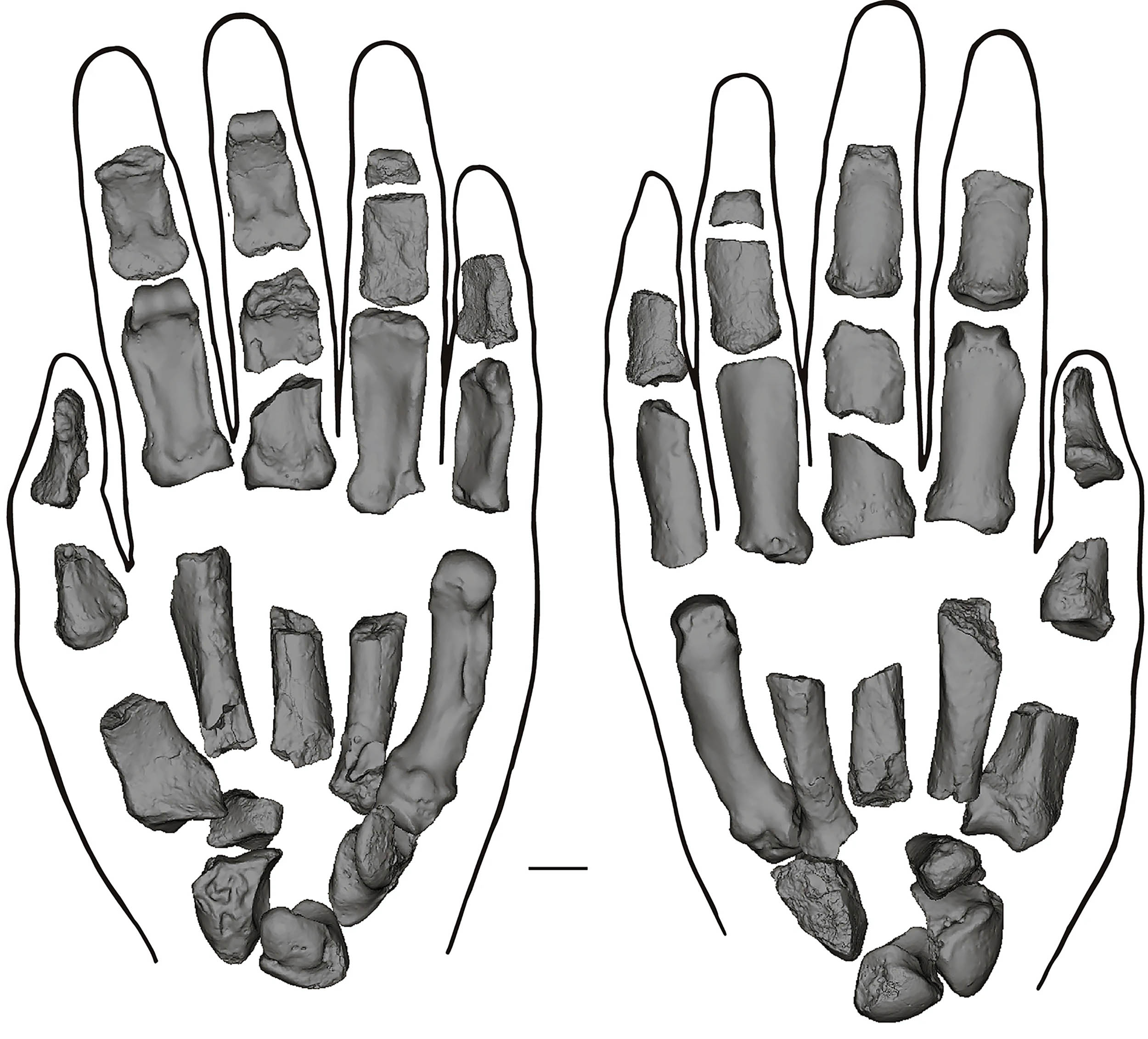 The fossil find includes most of one hand, parts of a foot, teeth, a forearm fragment, and skull pieces from one individual.