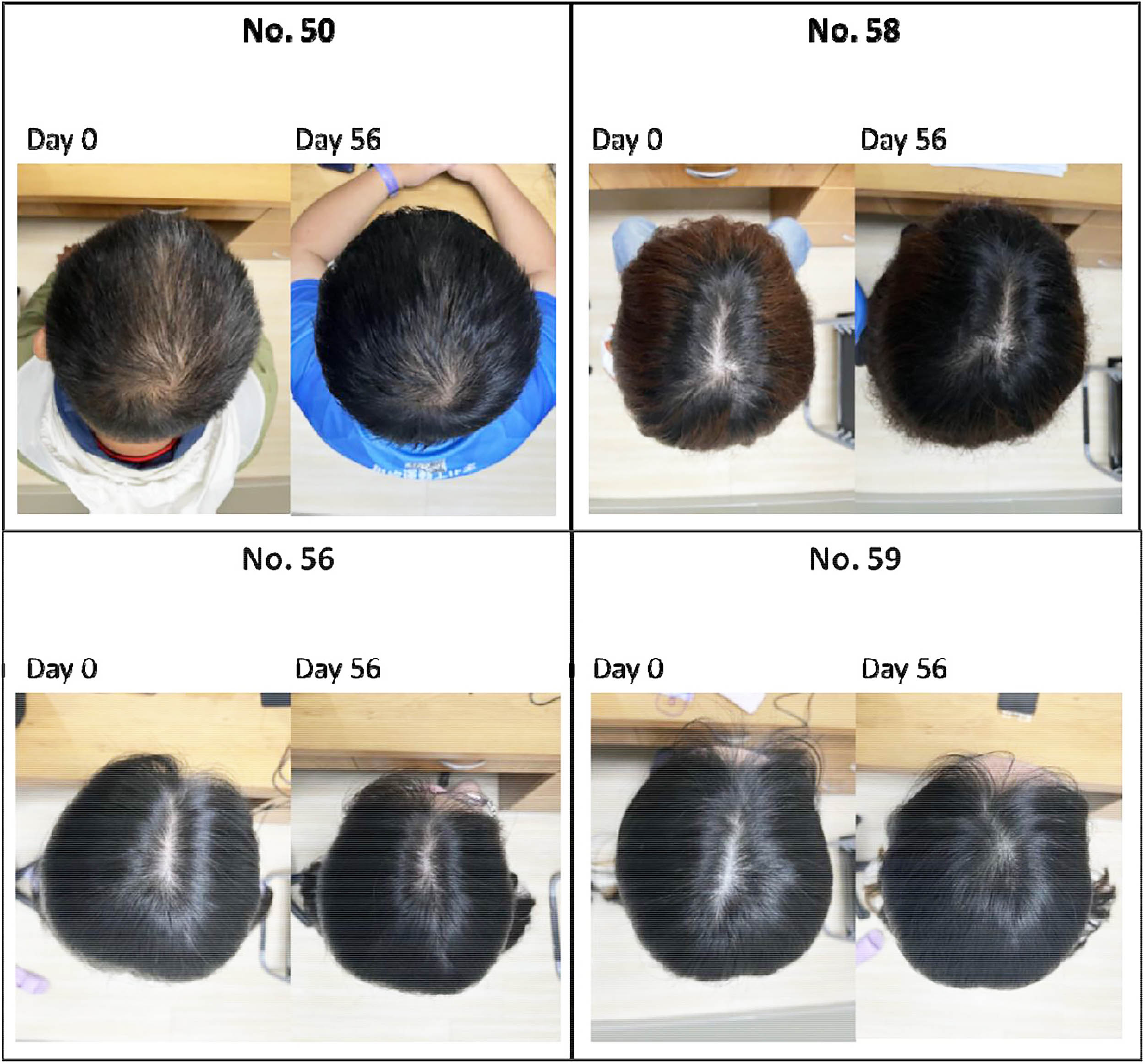 Volunteers ages 18 to 60 were randomly assigned to five groups, including a placebo. Technicians measured density, thickness, length, and shedding at days 14, 28, 42, and 56 using standardized tools.