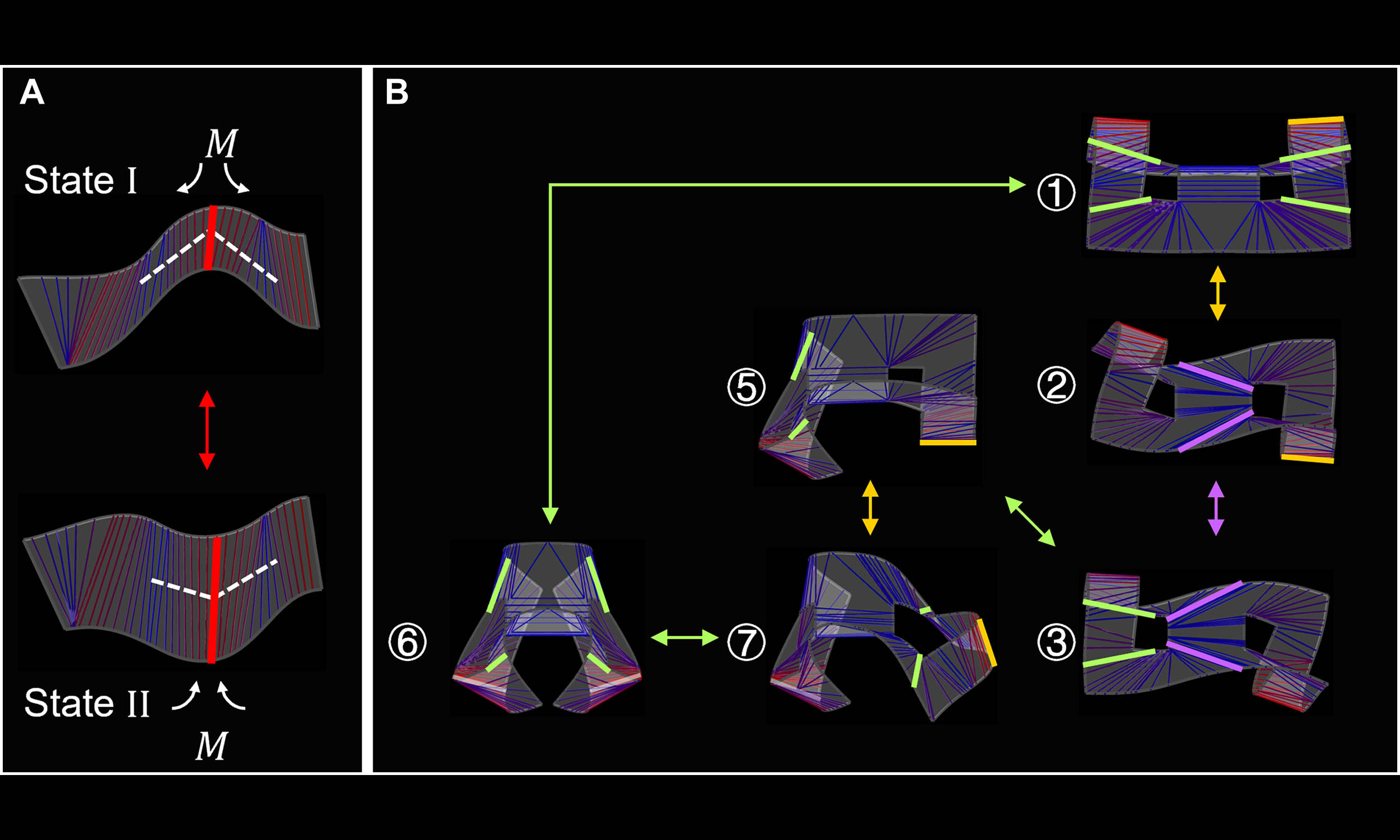 The sheets use developable surfaces, thin shells that bend without stretching, a geometry that raises the number of distinct shapes. When the team bonds the edges of a cutout, they preload elastic energy that later drives fast snapping between states.
