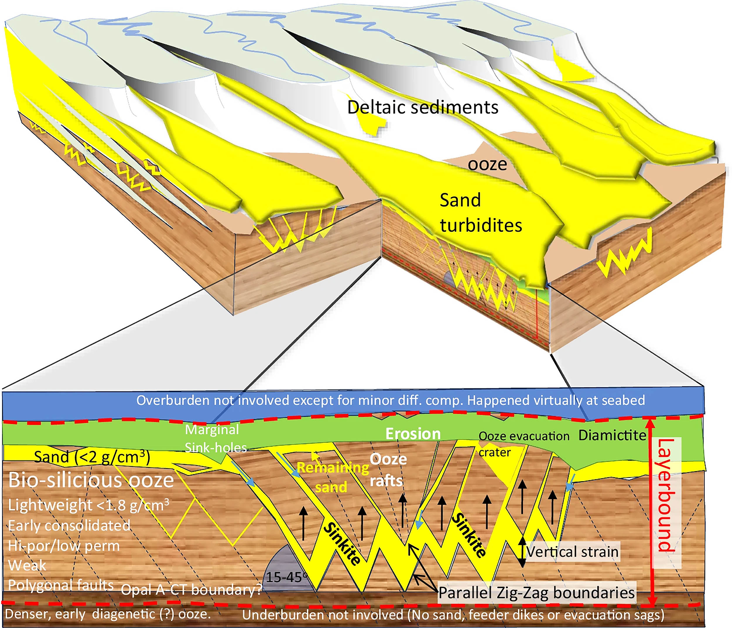 These lines of evidence build a coherent case for buoyancy‑driven stratigraphic inversion that operated near the seafloor and locally bent the law of superposition, which normally keeps younger layers on top of older ones.