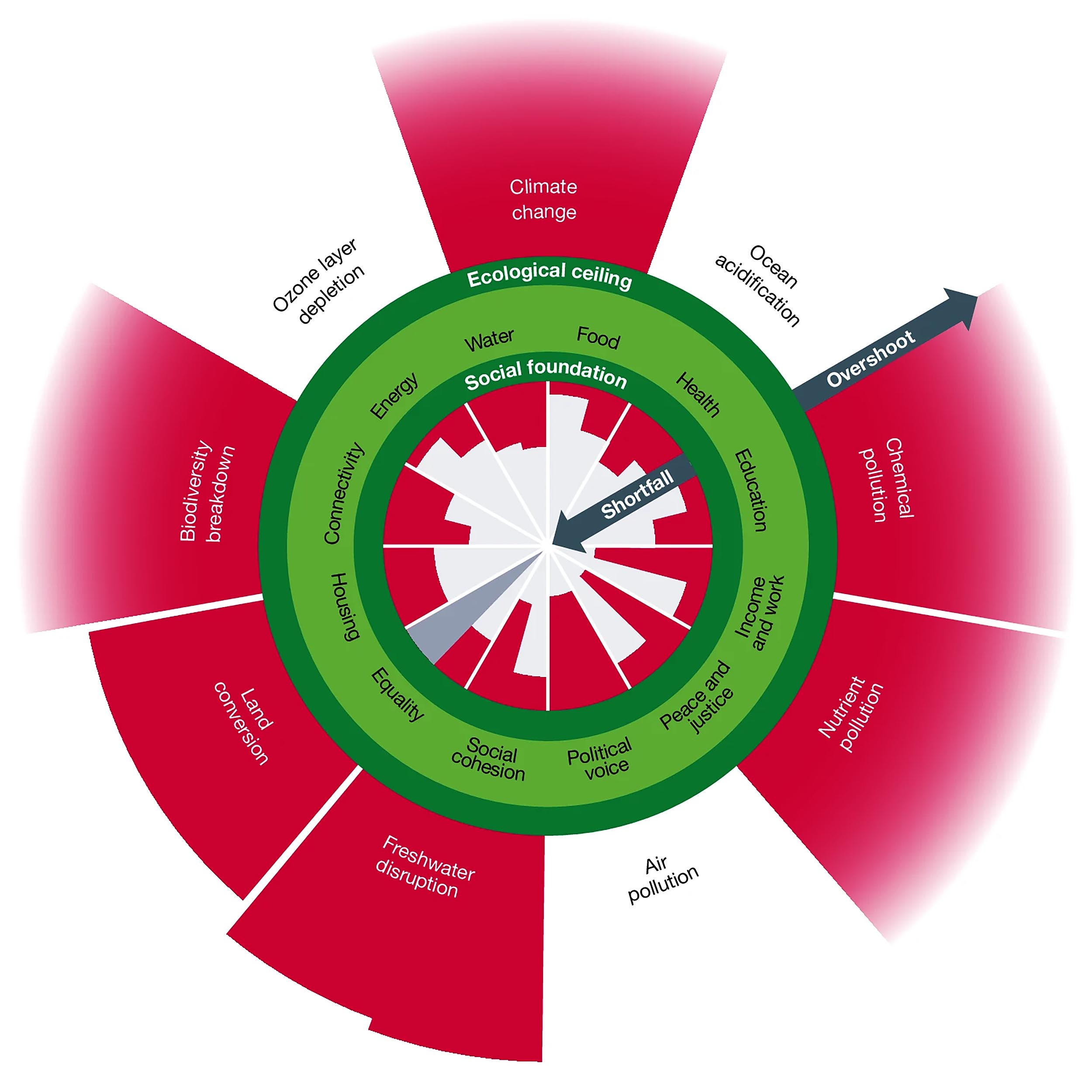 The Doughnut framework sets two rings: a social foundation below which people fall short on life’s essentials and an ecological ceiling above which human activity destabilizes Earth. The safe space sits between them.