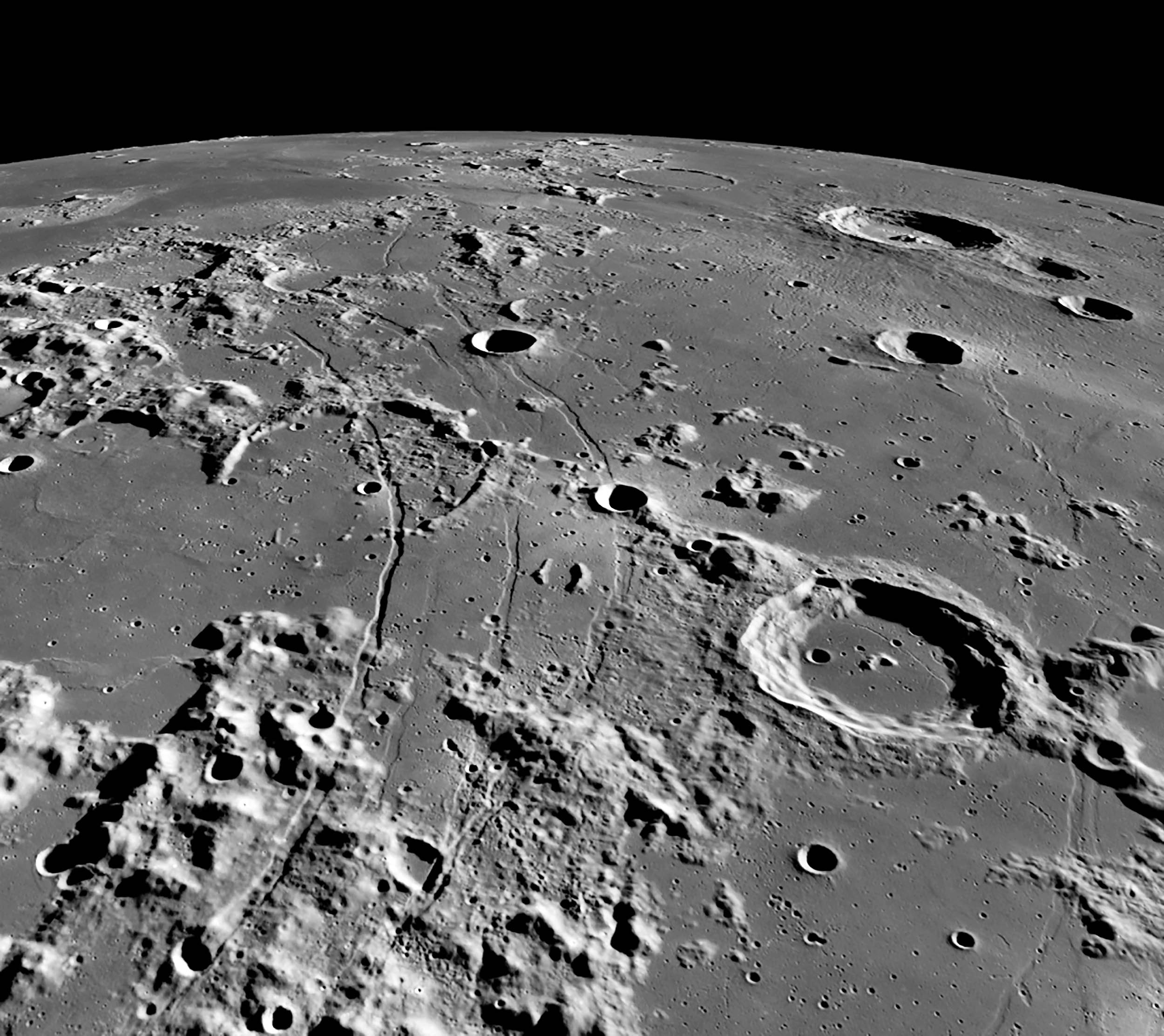 New oblique images from NASA’s Lunar Reconnaissance Orbiter Camera (LROC) reveal enormous cracks, called grabens, curling around an ancient lunar sea on the Moon’s near-side.